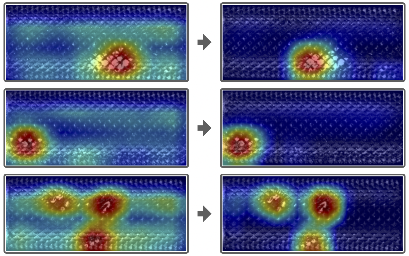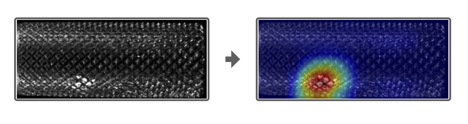 기존에는 아래 사진의 좌측처럼 CAM이미지에 노이즈가 많았습니다. 여기서 말하는 노이즈는 불량의 위치가 아님에도 불구하고 옅은 색의 히트맵이 시각화 된것을 말합니다. CAM의 작동 원리 보면 알겠지만, 이 옅은색의 히트맵이 시사하는 점은 ‘강하게는 아니더라도 약하게는 이 부분도 불량을 검출하는데 영향을 끼친다.’라고 해석해 볼 수 있겠습니다. 하지만, 실제로 저 옅은색의 노이즈 부분은 불량을 나타내는 feature는 아니었죠. 해당 문제를 Augmentation으로 해결해 볼 수 있었습니다. 학습 시 데이터를 다양한 방식으로 증강해 주었고, 특히 Blur와 같이 노이즈를 첨가하여 학습시켰을 때, CAM시각화에서 긍정적인 효과를 얻을 수 있었습니다.