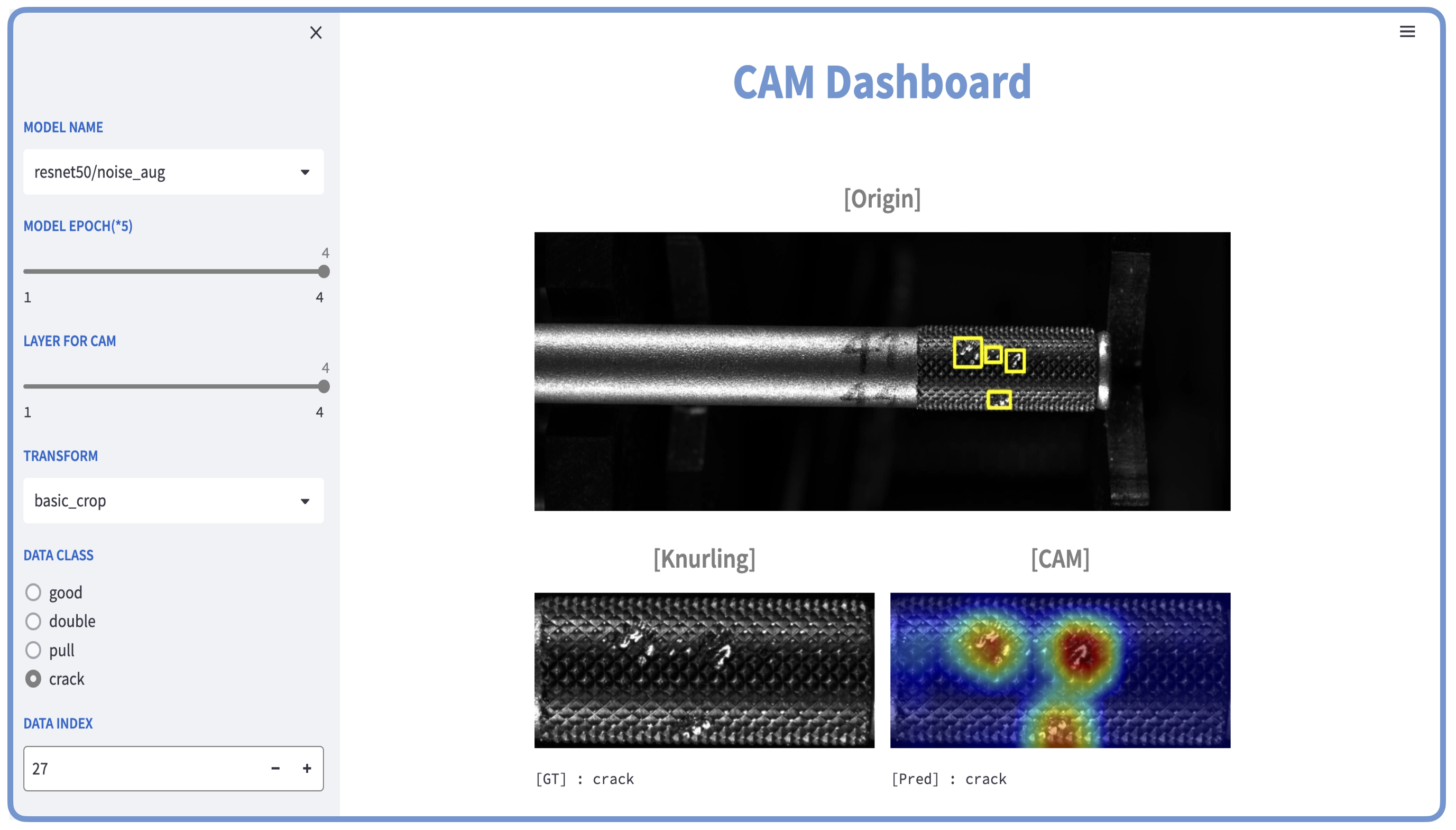 공장 측에 불량의 위치정보도 함께 제공해 주기 위해, CAM시각화를 최적화하기로 하였습니다. 여러 실험들을 해볼 필요가 있었고, 이 과정을 효율적으로 진행하기 위해 Streamlit툴을 활용해 대시보드를 만들어 봤습니다. 결론적으론 Augmentation, 전처리, 후처리 등을 통해 좀 더 적절한 CAM시각화를 얻을 수 있게 되었습니다.