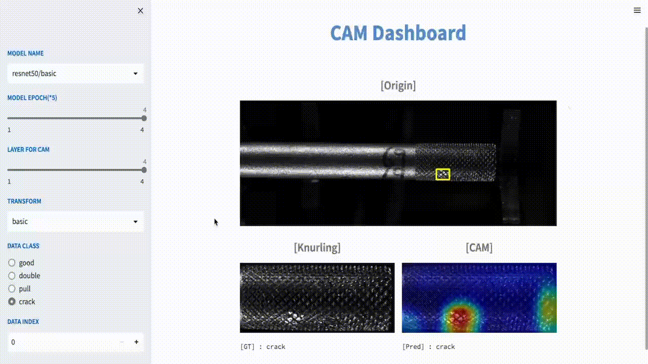 앞선 포스팅에서 분류 모델의 신뢰성을 위해 GradCAM을 적용해 봤습니다. 그 결과, 높은 성능에 대한 신뢰성을 어느 정도 확보할 수 있었죠. 단순히 신뢰성 확보를 위해 CAM을 적용해 본 거지만, 이 시각화 정보를 공장 측에도 제공해 주면 좋겠다는 생각이 문득 들었습니다. 단순히 어떤 불량인지 분류하는 걸 넘어, 불량의 위치정보도 함께 제공해 주면 공장 설비를 관리하는데 도움이 될 수 있기 때문입니다. 그래서, 해당 CAM시각화를 가장 잘 나타내는 분류 모델을 탐색해보고자 합니다. 기존에는 단순히 수치적인 성능을 보고 최종 모델을 선정했다면, 이번 프로젝트에서는 CAM 시각화의 정성적인 평가를 통해 모델을 선정해 보는 거죠. 이번 글은 이러한 탐색 과정을 효율적으로 진행하기위해 CAM 대시보드를 개발하고, 최적의 CAM시각화를 얻어내는 과정에 대한 내용이 될 것입니다.