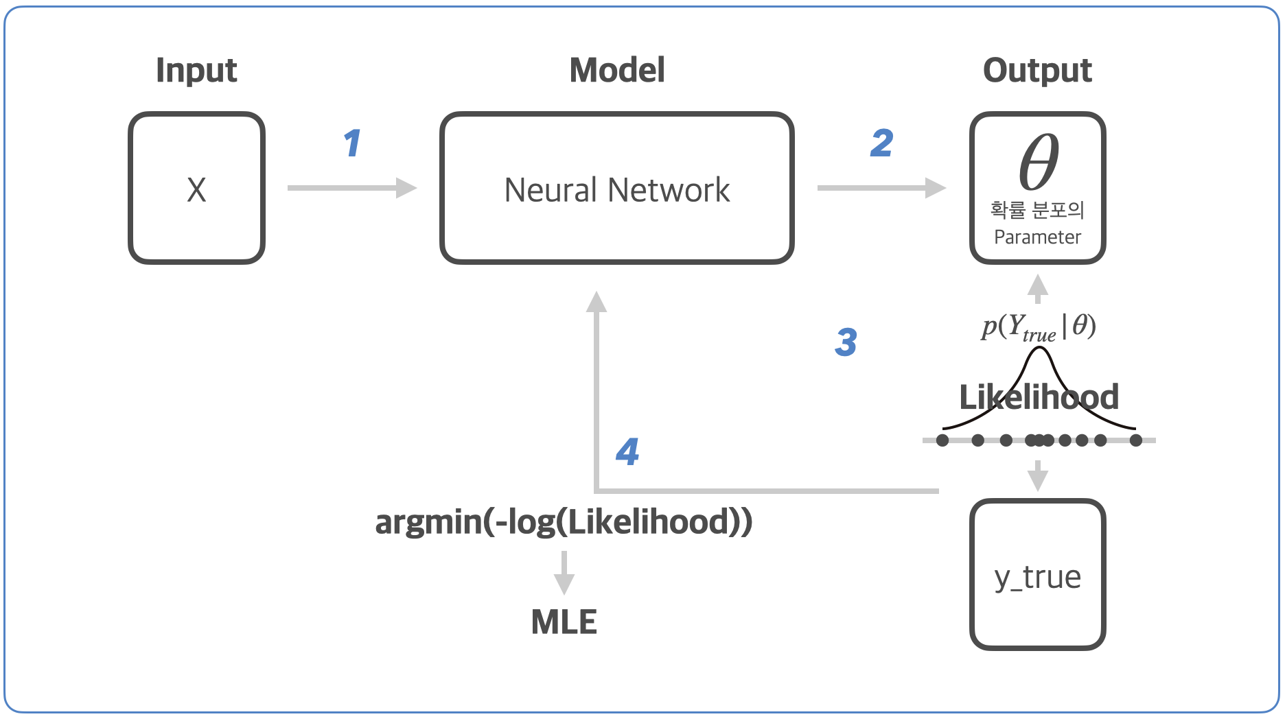 - 이렇게 얻은 값 $\theta$를 통해 사전에 정의한 확률 분포를 나타내고 Likelihood $p(Y_{true}|\theta)$ 를 구하게 된다.(이때의 $\theta$는 모델을 구성하는 파라미터가 아닌, 모델의 출력값인 확률 분포의 파라미터라는 걸 주의해야 합니다.)