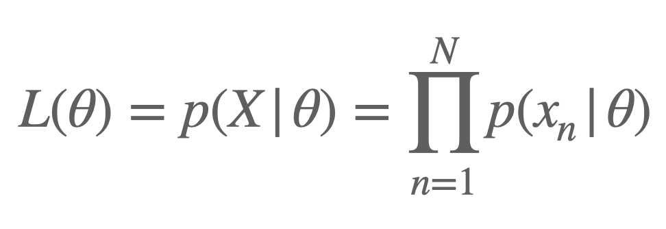 위의 3개의 분포 중에서 남자의 키 데이터를 가장 잘 표현하고 있는 분포는 어떤걸까요? 아마 직관적으로 A분포가 가장 잘 표현하고 있다고 느끼실 겁니다. 잘 나타냄의 정도를 수치적으로 나타내기 위해 우리는 Likelihood를 구할 수 있겠습니다. 위의 10개의 남자 키 데이터를 각각의 확률 분포(A, B, C)에 넣어 얻은 확률들을 모두 곱한 값(Likelihood)을 비교해 보면 됩니다. 그렇게 하면 A에 해당하는 Likelihood 값이 가장 큰 값이 나올 것입니다. 이를 수식으로 표현해 보면 아래와 같습니다.