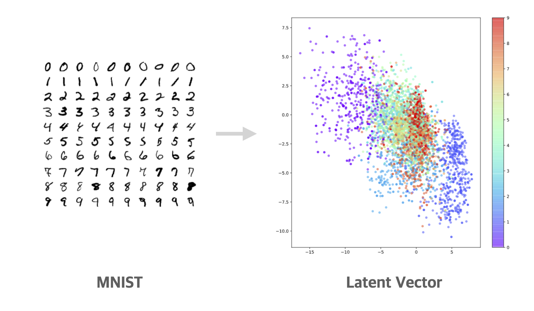 위의 예시는 0~9 사이의 손글씨 데이터셋인 MNIST를 Encoder에 입력하여, 2차원의 latent vector로 나타낸 예시입니다. 기존 MNIST데이터는 28*28의 흑백 이미지로써 784차원으로 표현할 수 있는 데이터였습니다. 이를 2차원 공간으로 압축하여 나타낸 것이죠. 이렇게 압축하는 과정에서, 위에서 언급한 Manifold를 학습했을 것이고요. 해당 2차원 상에는 2개의 축이 있는데, 이러한 축들이 각각 무엇을 의미하는지는 모릅니다. 다만 확실한 건, 해당 데이터들을 가장 잘 표현해 낼 수 있는 중요 feature 들이라는 건 분명합니다. Latent Vector를 잘 살펴보면, 손글씨 0과 1은 전혀 다른 영역에 존재함을 볼 수 있습니다. Encoder가 학습한 Manifold상에서는 이 둘의 feature들이 전혀 다른 속성을 가지고 있다는 것이죠. 반면 9와 8은 서로의 영역이 다소 겹쳐있음을 볼 수 있습니다. 이처럼 Latent Vector는 고차원의 데이터를 저차원으로 나타낸 벡터이며, 해당 데이터의 주요 feature들을 가지고 있음을 알 수 있습니다.