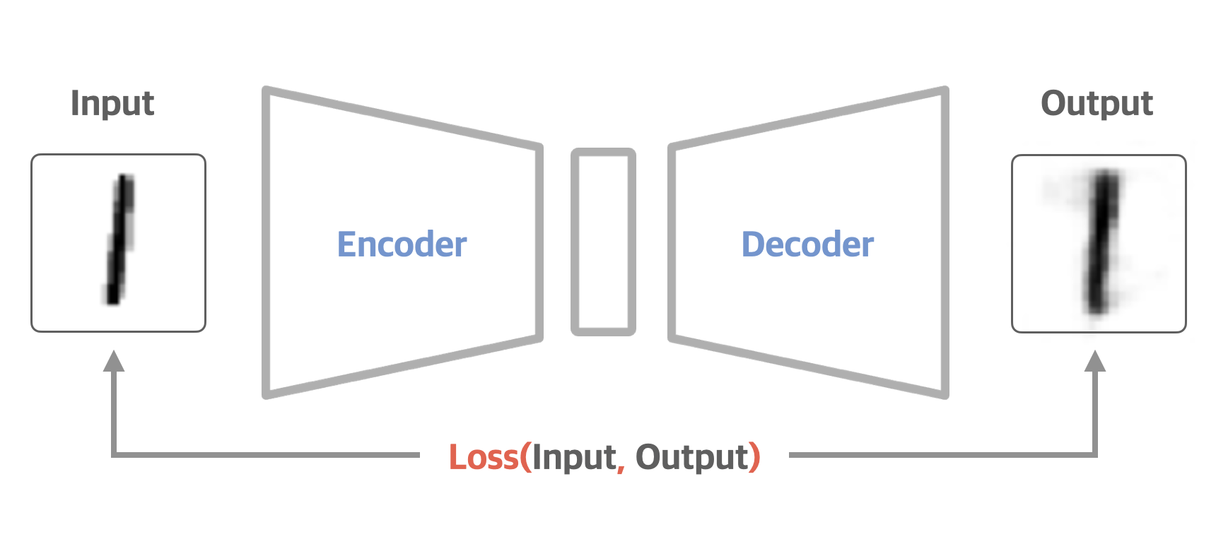 일단 압축을 해보고, 이 압축정보를 토대로 다시 원본 데이터로 잘 복원해 낼 수 있다면, 이 압축은 성공적이다. 압축된 정보를 토대로 다시 복원해 봤는데 전혀 엉뚱한 데이터라면 이는 잘못 압축된 것이다. 이러한 기준을 토대로 학습을 진행하는 것이죠. 그래서 모델의 손실함수는 원본 이미지와 복원된 이미지와의 차이로 결정되며, reconstruction error라 합니다. 이는 마치 Unsupervised를 Supervised방식으로 해결한 것으로 볼 수 있으며, 입출력이 모두 자기 자신인 것으로 SelfSupervised Learning이라고도 부릅니다.