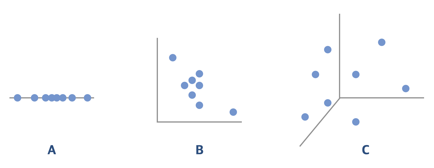 A예시처럼, 10개의 데이터를 놓을 수 있는 일차원 직선이 있고, 해당 직선위에 8개의 데이터가 놓여있다고 생각해 봅시다. 우리가 다루는 차원 속에서 약 80%가 데이터로 모여있기 때문에 이를 추론하기 위한 모델링을 수월하게 할 수 있습니다. 이제 B처럼, 2차원 공간에 똑같이 8개의 데이터가 놓여있다고 생각해 봅시다. 해당 차원 내에서 약 8%만이 데이터로 모여있기에, 이를 추론하기 위한 모델링을 진행하기는 어려울 것입니다. 92%가 빈 공간이기에, 턱없이 부족한 데이터라는 거죠. 더 나아가 C처럼, 3차원으로 확장해 보겠습니다. 3차원 공간에 8개의 데이터가 놓여있다면, 약 0.8%의 데이터만이 확보된 것입니다. 이를 추론하기 위한 모델링은 불가능할 것입니다. 즉, 차원이 늘어날수록 해당 데이터의 분포를 모델링하기 위해서는 기하급수적인 데이터를 더 필요로 하게 되는 것입니다. 이를 차원의 저주라고 하죠. 이러한 관점에서 저차원의 Manifold로 데이터의 영역을 찾아낼 수 있다면, 고차원에서 분석하기보다 훨씬 더 수월할 수 있겠습니다.