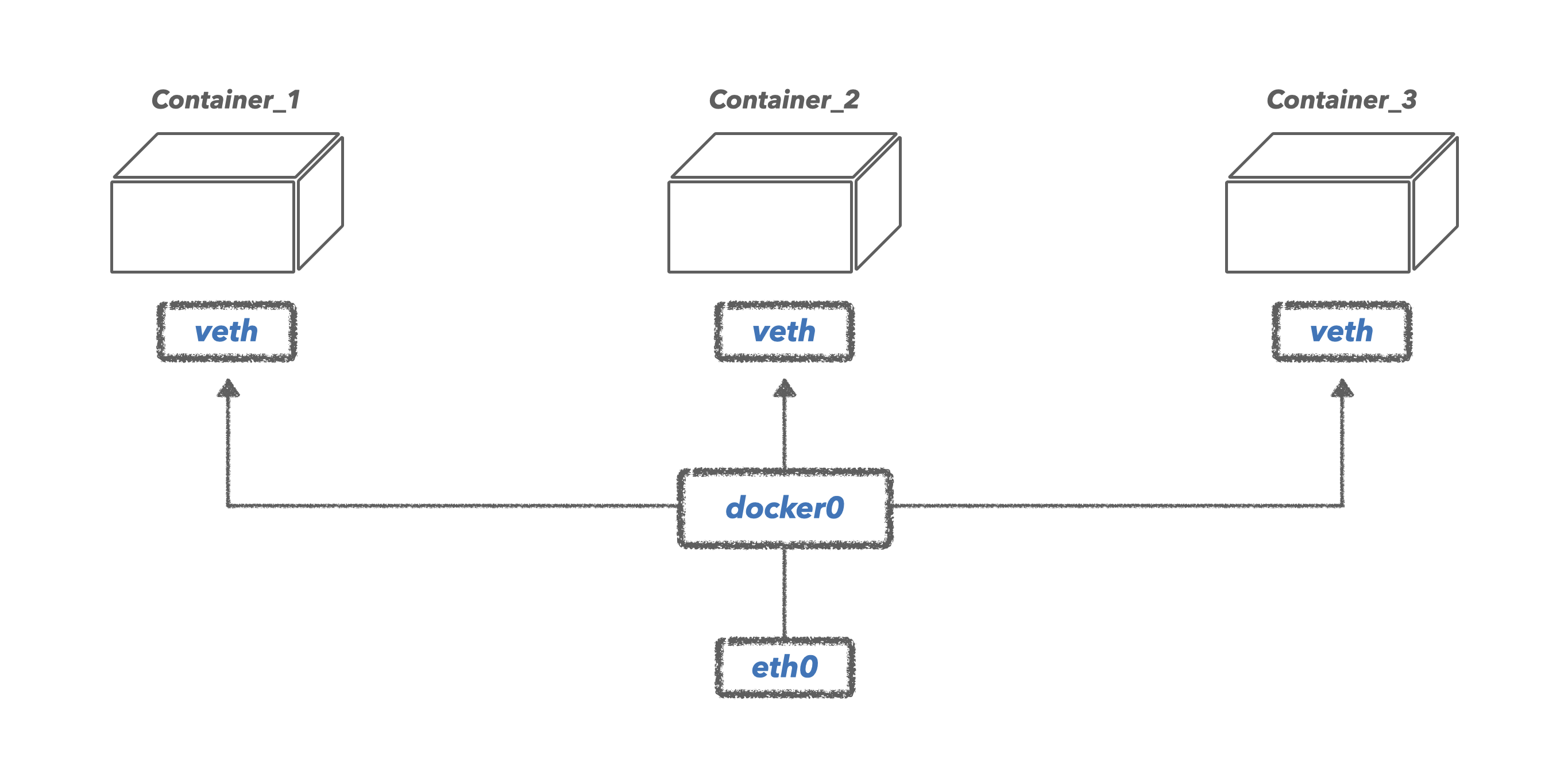 veth는 컨테이너의 내부 IP를 외부와 연결해 주는 역할을 하는 가상 인터페이스입니다.(virtual eth의 약자입니다.) 컨테이너가 생성될 때 veth가 동시에 생성되며, 이 veth를 호스트의 eth0과 연결시킴으로써 외부와의 통신이 가능해집니다. 그리고 이 연결을 docker0과 같은 브리지가 수행하게 되죠.