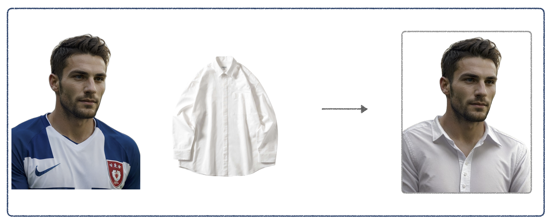 - 글자나 숫자가 있는, 복잡한 패턴을 가진 옷에 대해서는 반영을 잘 못합니다. 위의 예시들처럼 무늬가 없는 단순한 옷차림에 대해서는 웬만한 포토샵의 합성만큼이나 자연스러운 결과물을 내줍니다만, 복잡한 패턴까지는 완벽하게 반영해 주진 못합니다.