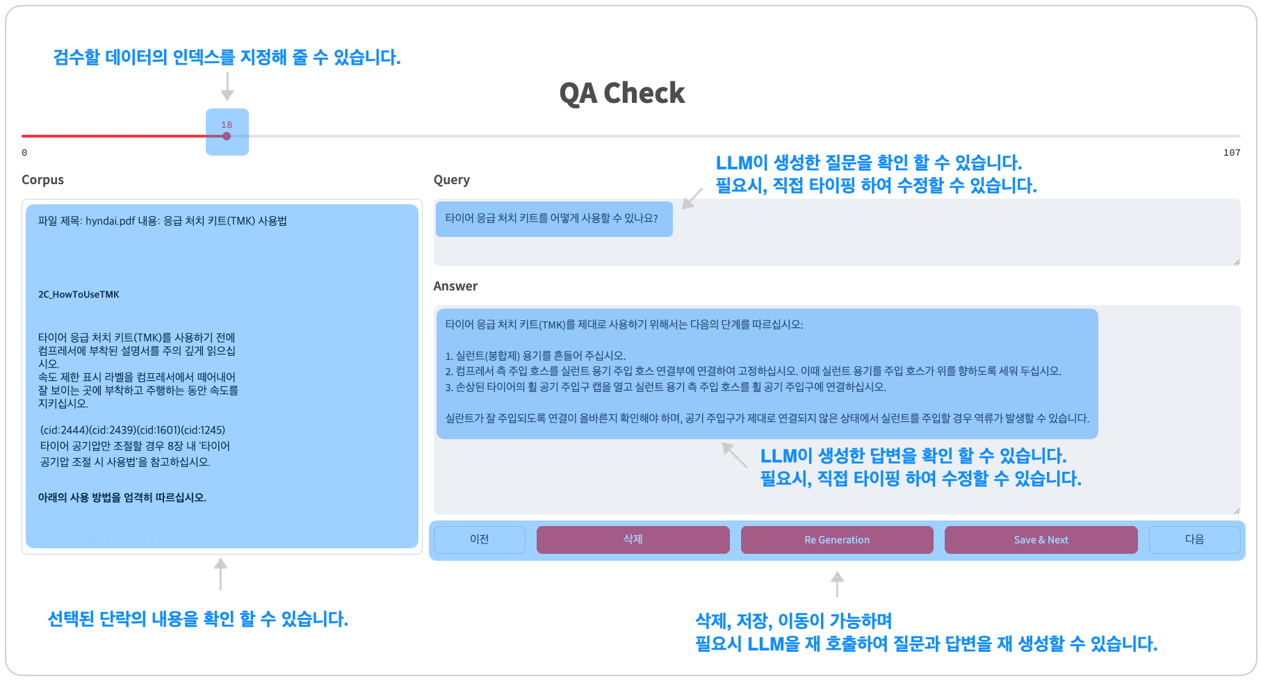 하지만, 수백 개의 평가 데이터를 일일이 검수하고 수정을 하다 보니, 조금 더 효율적인 방법을 추구하고 싶었습니다. 수정, 삭제, 재생성, 이어서 하기 등 검수하는 과정에서 편리한 기능이 더해진 도구가 있으면 어떨까?