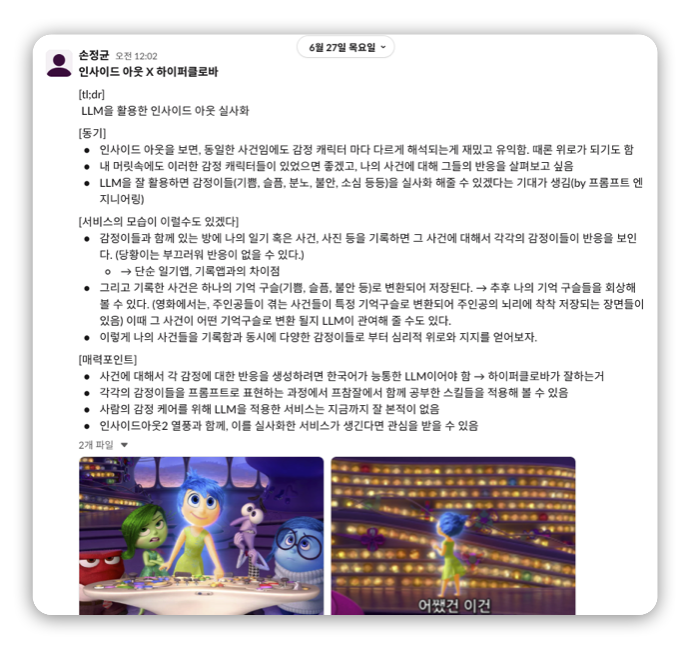 사실 인사이드아웃 영화를 보고 나오자마자, 노션에 메모해 놓은 아이디어였다. 당시 인사이드 아웃 2가 개봉했을 때라, 많은 분이 흥미를 가져 주었다. 결국 3명이서 한 팀을 이루어, 위의 AI 서비스를 만들게 되었다.