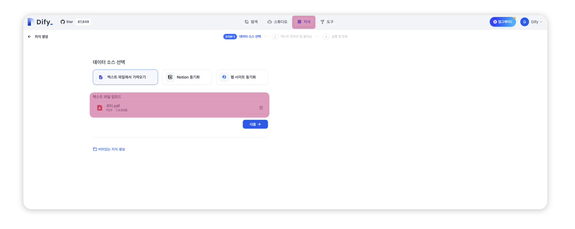 - 우선, 차량 사용 설명서를 LLM이 활용할 수 있도록 VectorDB로 구축해야 합니다. Dify에서는 지식 창을 통해 원하는 문서를 손쉽게 업로드할 수 있습니다.